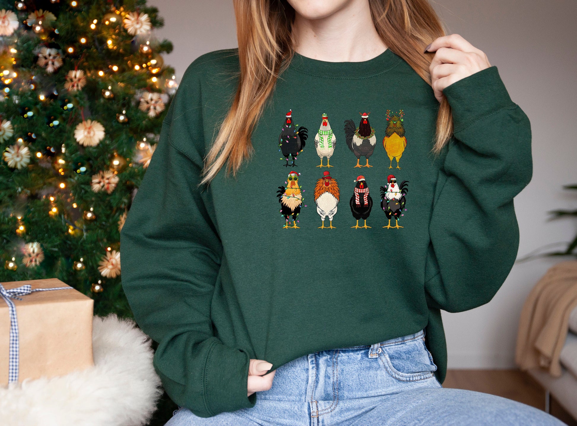 Cute Christmas Chickens Sweater,Christmas Farm Animal Sweatshirt,Chickens Lover Sweat,Christmas Crewneck,Holiday Sweatshirt,Christmas Lights